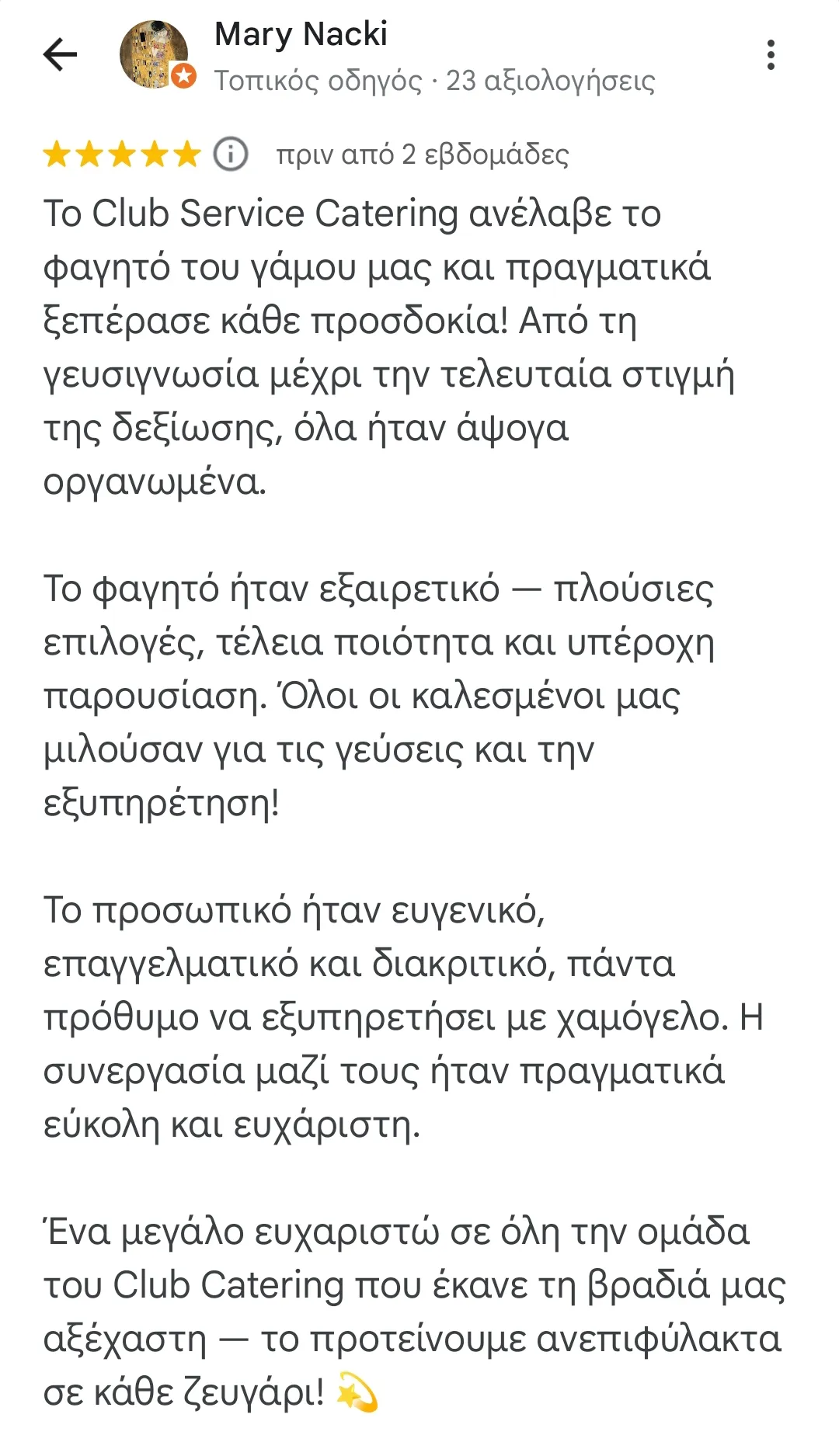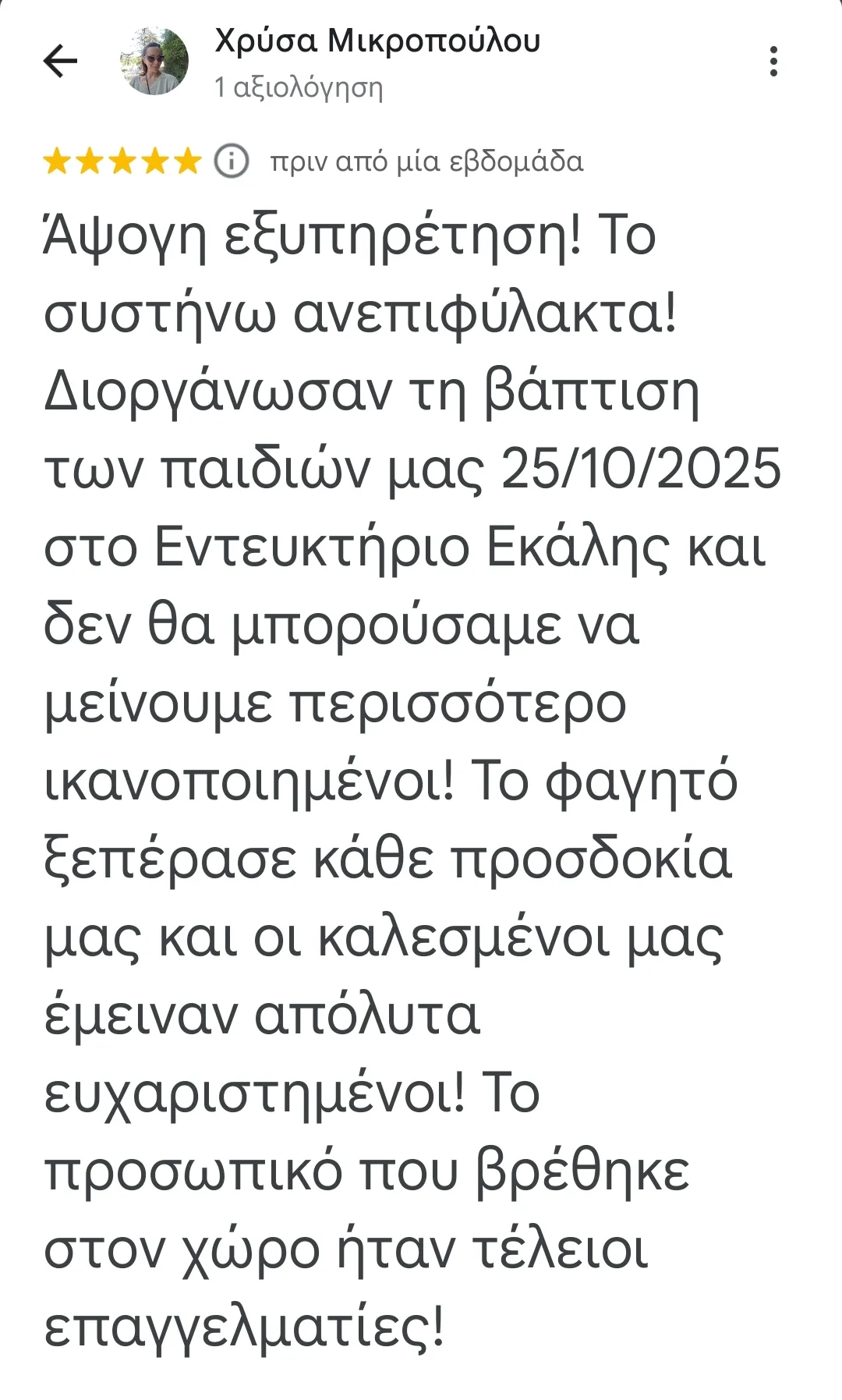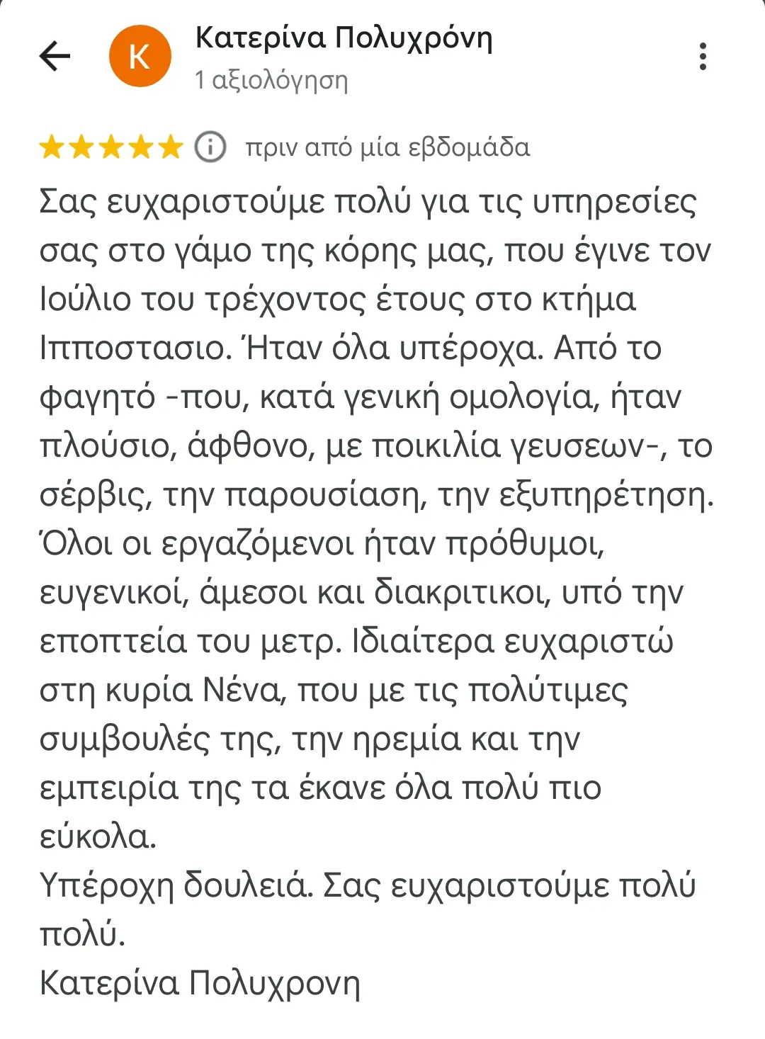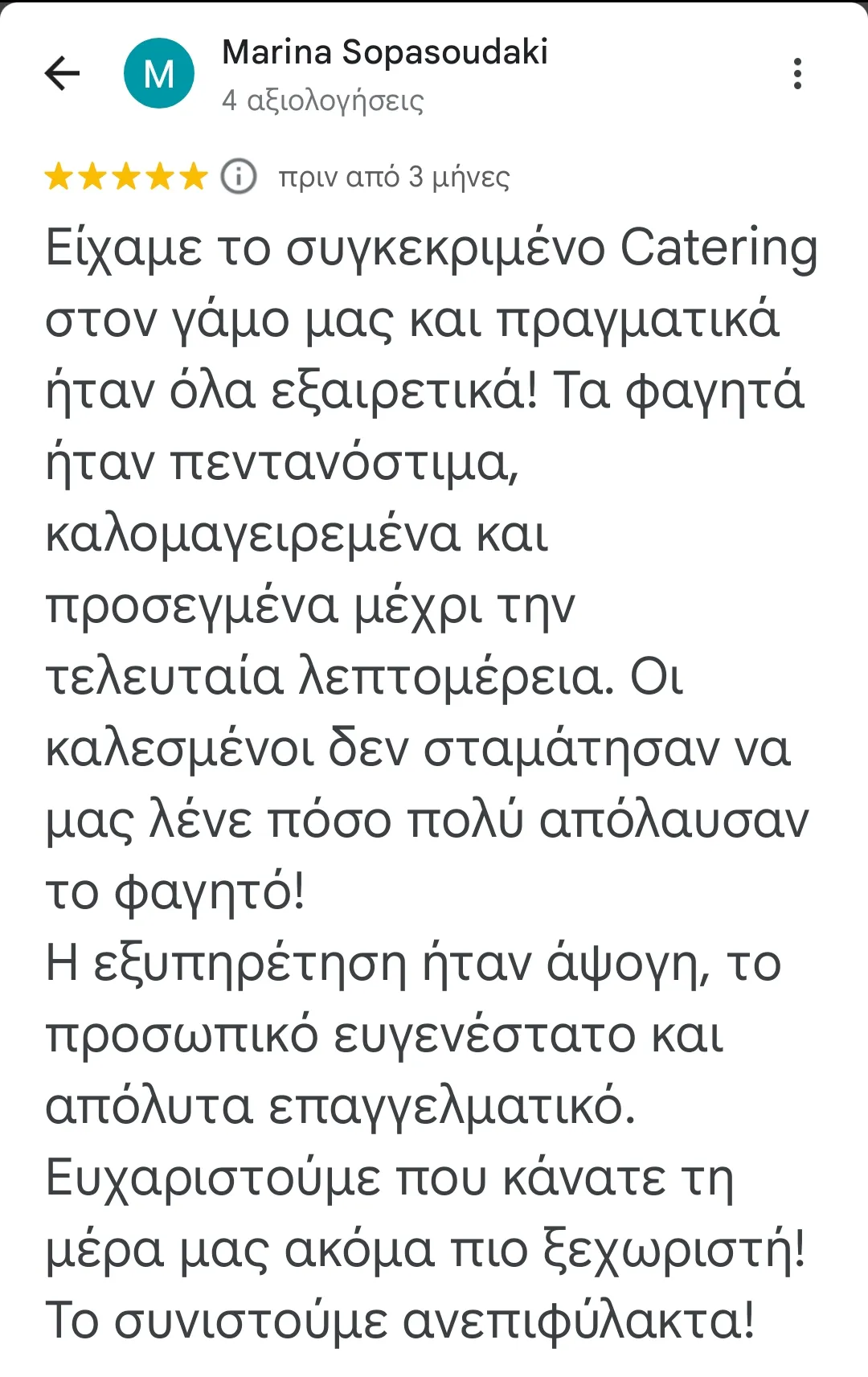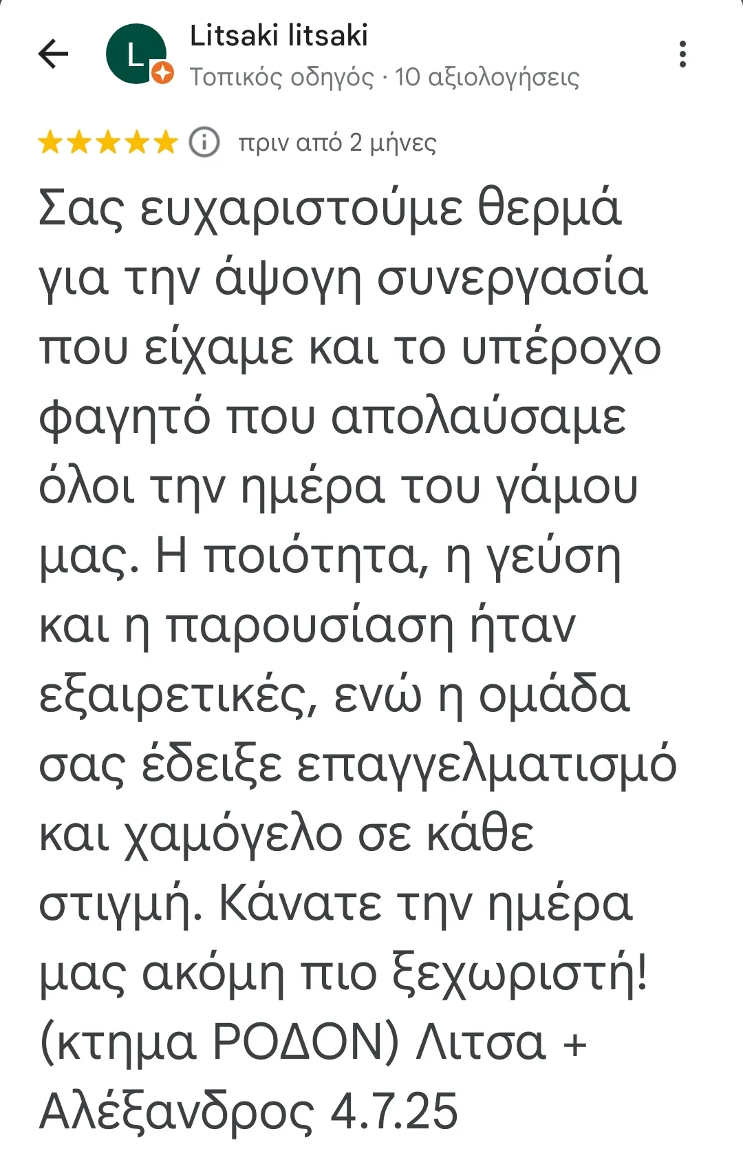 Είμαστε πραγματικά περήφανοι που η βαθμολογία μας στο Google Reviews παραμένει σταθερή, με εκατοντάδες αυθεντικά σχόλια από πελάτες που ζήσαμε μαζί τους όμορφες στιγμές.